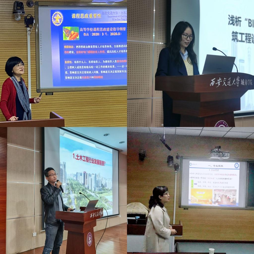 下午两点,土建系廖红建教授做了题为“工科专业课的课程思政”报告,廖老师以《土力学》课程为背景,结合教学案例,讲述了如何挖掘专业课的思政元素、如何与课程内容有机融合以及能达到的思政目标。接着,康彦青、黎莹、白梦梦三位教师根据自身专业特点和教学研究,分享了教学改革方面的一些做法。最后参加公司青年教师授课竞赛的郭秀芹老师和白梦梦老师进行授课试讲,廖红建教授、凌伟副教授以及到场各位老师进行了点评交流。