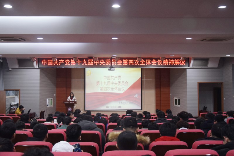 土木建筑工程系于12月25日在F100报告厅召开会议,师生集中学习十九届四中全会精神,系团学工作负责人吴丹主持和引导全体员工党员、积极分子和班团干部一同参与本次学习。