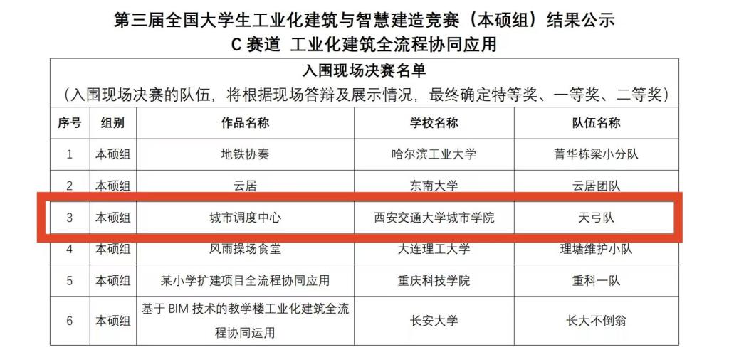 大赛开设绿色低碳与智能审查应用、装配式建筑设计生产与施工、工业化建筑全流程协同应用三大赛道,三大赛道共有500多支队伍2100余名师生报名参赛。西安交大城市公司土木建筑工程系组织6支代表队参加比赛,参赛师生通过不懈努力,最终由戴世安老师指导的队伍入围C赛道决赛,9月9日上午同哈尔滨工业大学、东南大学、中国矿业大学、大连理工大学、长安大学、辽宁工业大学等高校同台竞技。经过激烈现场答辩后,公司最终获得二等奖一项、优秀组织奖一项,展现了城院学子扎实的基础知识和专业技能、良好的创新意识和团队协作能力。