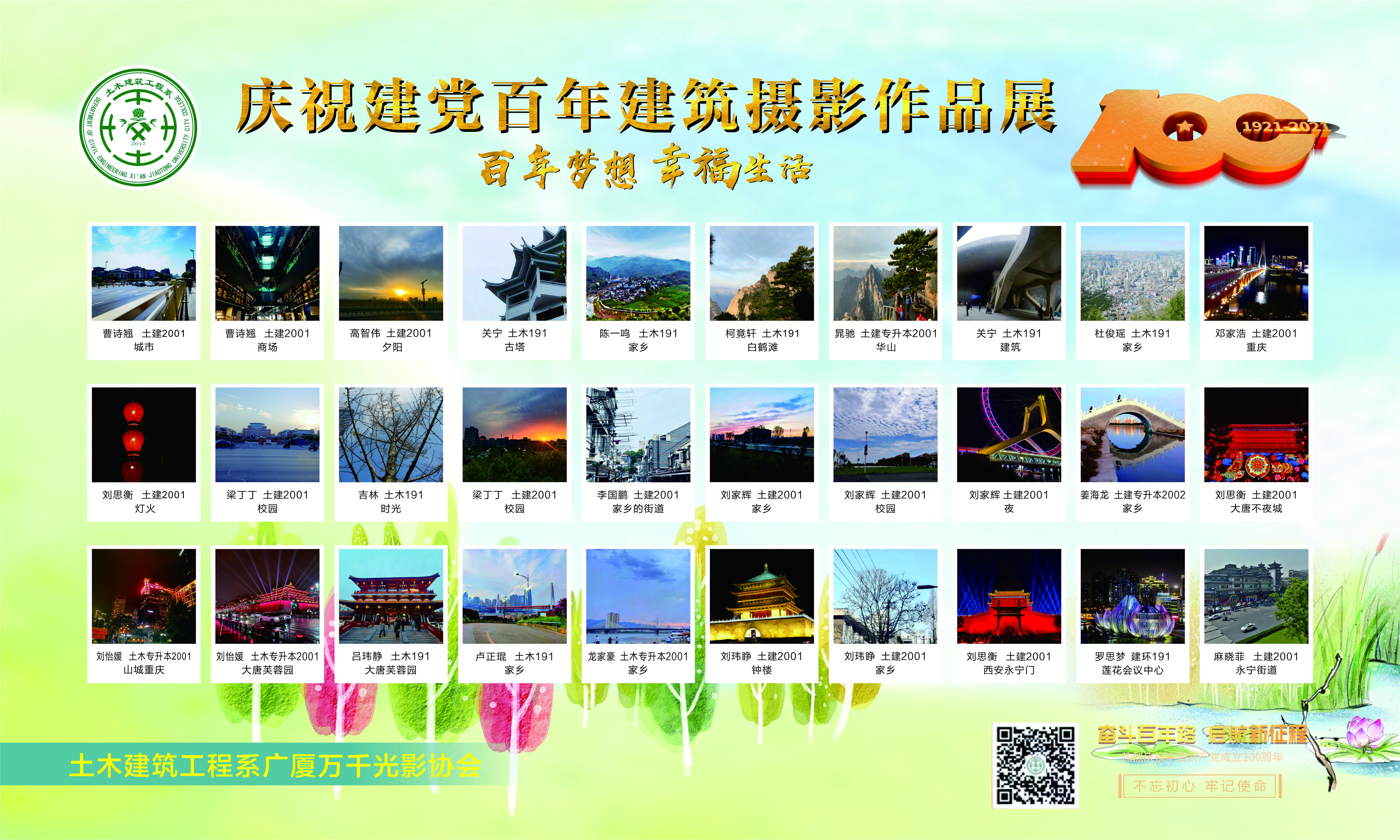 为庆祝中国共产党成立100周年,展现党的伟大成就及党领导全国人民创造的幸福生活,西安交大城市公司土木建筑工程系“广厦万千”建筑光影协会员工社团在本学期举办了“百年征程、百年梦想”摄影大赛,并将征集的优秀作品在“7.1”前后进行了为期一周的展出,营造欢庆氛围。