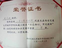 2018年3月,荣获得机械系“党章党史”知识竞赛一等奖;